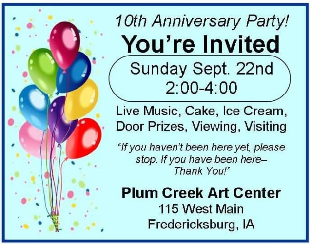 We celebrated our 10th year anniversary in September of 2024 with a party!! The Sumner-Fredericksburg High School Jazz groups performed, we served cake, ice cream and punch/coffee. The organizers petitioned our artists for raffle prizes, and we certainly appreciate their generosity.